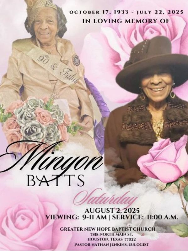 Minyon Batts was the matriarch of her family. She was the mother of 8 children and 9 grandchildren whom she loved dearly. She had many nieces, nephews, cousins and friends who she loved and who loved her dearly.